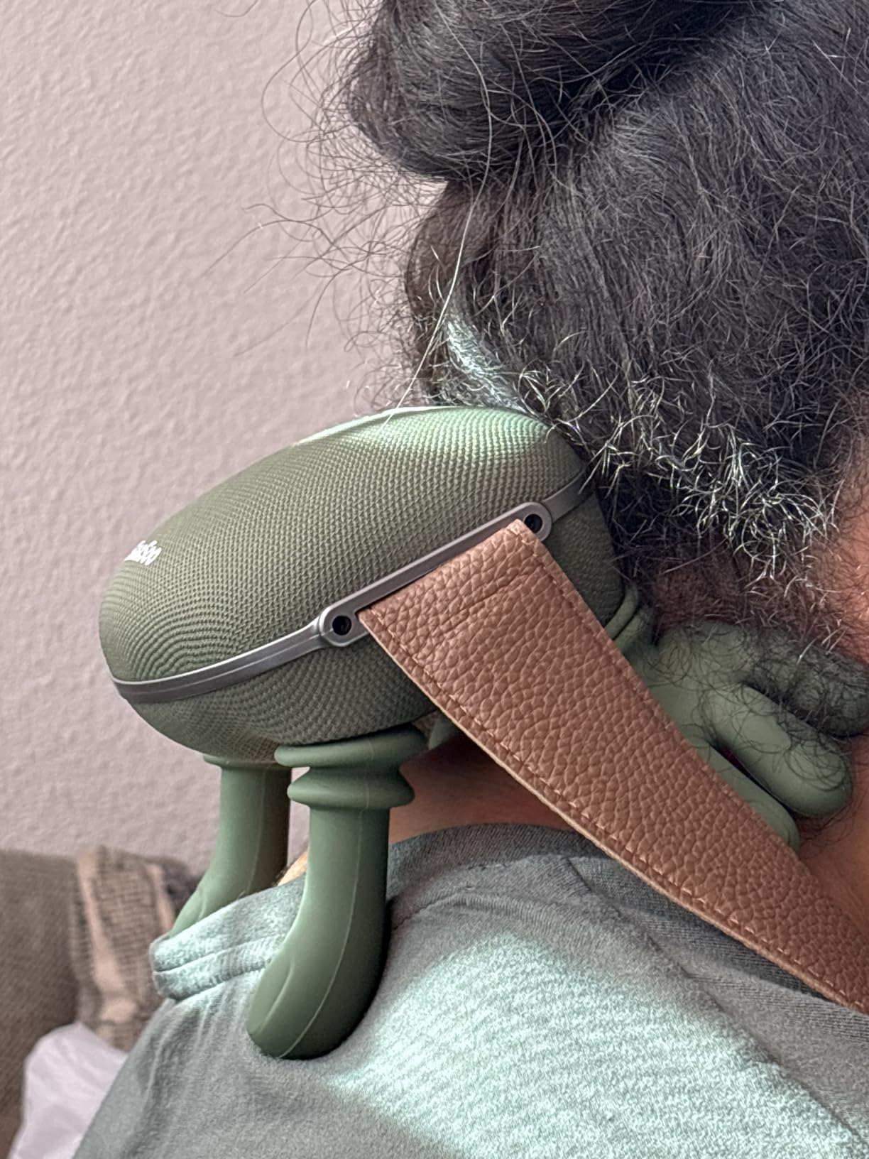 LOVE THIS THING! It may look creepy, but this massager works just like real hands. It stays securely when strapped using the included straps, and they're easy to secure. I love the heat feature, it adds just the right amount of warmth to enhance the massage. I had it on my neck for 20 minutes and the tension was reduced.